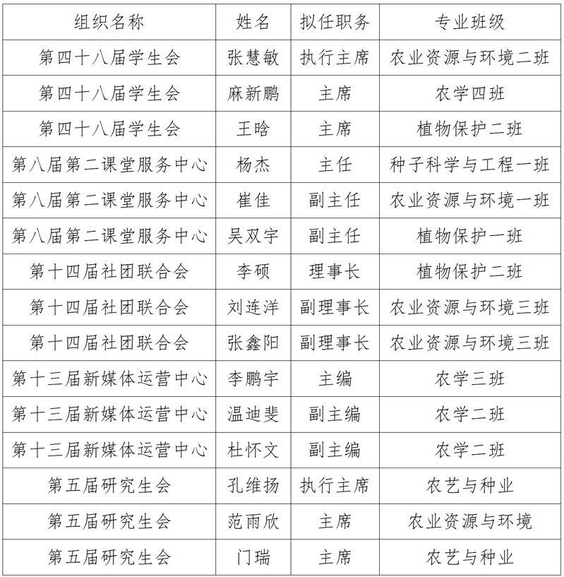 我院2025年学生组织管理层换届竞聘工作已完成个人申报、资格审查、竞职演讲、评审投票、组织考察等环节,经学院团委研究决定,拟任命杨杰等15名同学为农学院学生组织管理层学生骨干,现将具体名单公示如下: