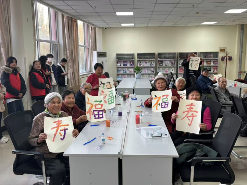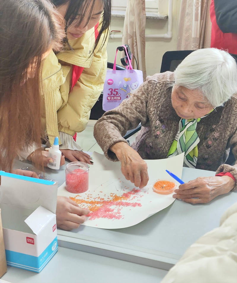 随后,志愿者引导老人们共同参与以“福、禄、寿”为主题的种子拼贴画创作。以各类种子为材料,在志愿者的协助下,老人们专注投入,细致粘贴,一步步完成一幅幅独具韵味寓意吉祥的种艺作品。这些作品不仅展现了老人们的耐心与创造力,也凝聚了两代人之间的协作与情谊。