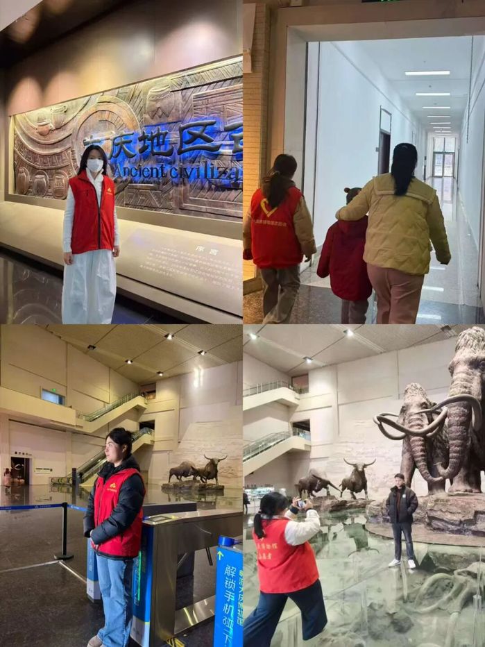 活动当天,身着统一志愿服装的农学院志愿者们准时集结,在博物馆专业讲解员和活动负责人的指引下,迅速投入各个岗位。针对游客合影需求,志愿者主动提供“暖心拍照”服务,耐心帮忙选取角度、操作设备,解决了大家“拍景顾不上拍人”的难题,定格下不少参观中的温馨瞬间;在展厅内,部分志愿者承担文物巡查与展陈维护工作,用软布轻轻擦拭展柜玻璃,留意展厅温湿度变化,还轻声提醒游客勿触摸展品,全力守护文物与观展秩序;在人流密集的互动体验区和休息区,志愿者们疏导人群、提醒安全注意事项、整理公共设施,保障参观环境安全整洁;经过前期培训的志愿者,还化身“文化传播者”,在恐龙骨架、猛犸象化石等镇馆之宝前,用通俗易懂的语言为观众尤其是研学小学生讲解古生物知识,通过互动问答激发大家的兴趣,让静态展品“活”了起来。