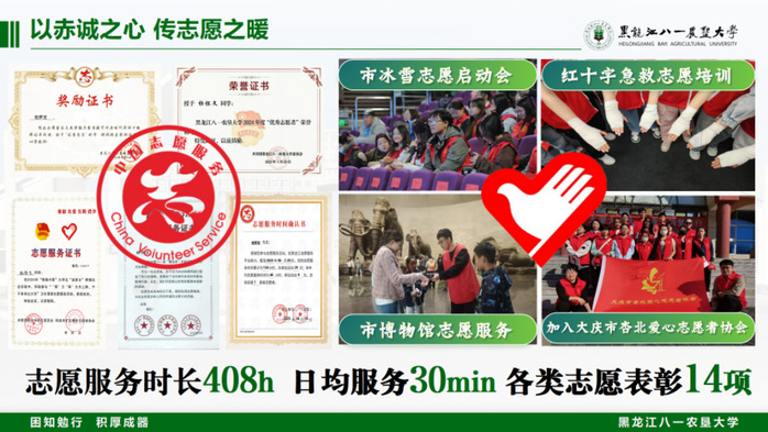 于服务中诠释价值,在奉献里定义青春。他将志愿服务内化为生活习惯,累计服务时长408小时,年均参与活动60次。在黑龙江省第十九届学生运动会中担任宣传信息组志愿者,获评“优秀志愿者”;还荣获黑龙江省志愿服务爱心奖、省志愿服务联合会培训优秀学员、校优秀志愿者等表彰14项,以实际行动践行青年责任。