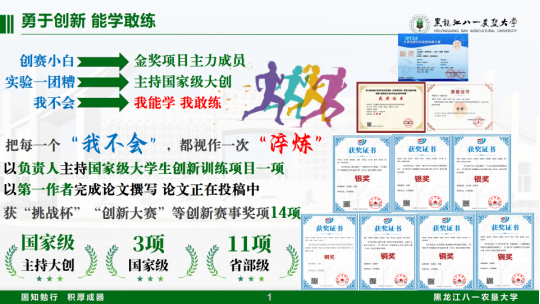 秉创新之思勇探未知,践求索之行敢闯难关。他勇于创新,结合专业所学知识,在姜丽丽老师的指导下,主持国家级大学生创新创业训练计划项目《光周期响应差异背景下 COMT 基因介导的马铃薯褪黑素合成与块茎形成关联机制研究》。在以赛促学、以创促研的道路上,他屡获佳绩:获中国国际大学生创新创业大赛省赛银奖3项、省赛铜奖4项;全国大学生生命科学竞赛省赛三等奖1项;“挑战杯”全国大学生课外学术科技作品竞赛省赛三等奖1项;全国大学生新文科实践创新大赛国赛铜奖2项、省赛金奖1项、省赛银奖2项,展现了出色的创新思维与科研潜能。