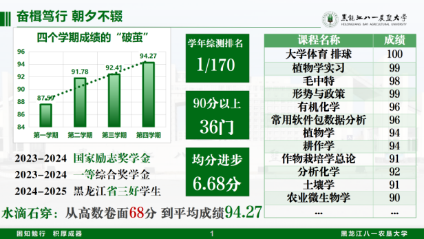 执强农之志深耕不辍,怀兴农之心奋楫笃行。他始终以提升专业素养与学习能力为要务,在学业道路上持续攀登:综合成绩从入学时的87.59分稳步跃升至94.27分,36门课程取得90分以上优异成绩,学业排名与进步幅度均稳居年级前列,持续保持班级第一、专业前茅,凭借持之以恒的努力与突出表现,他先后荣获国家励志奖学金、一等综合奖学金,躬身践行着“勤学善思、笃行不怠”的农学青年本色。