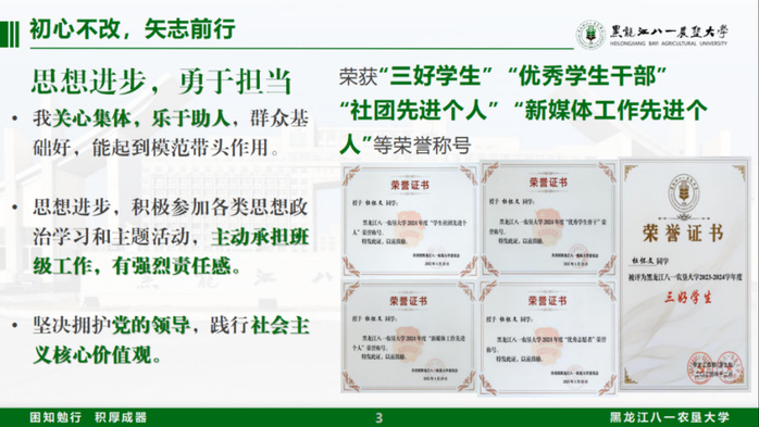 11月25日,黑龙江八一农垦大学2024-2025年度“十佳大学生”评选会圆满落幕,经个人申请、学院推荐、资格审查、现场答辩等环节,我院2023级农学专业杜怀文荣获“十佳大学生”荣誉称号。