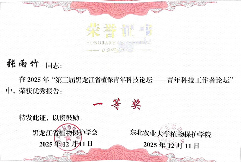 张雨竹青年科技工作者论坛荣获优秀报告“一等奖”