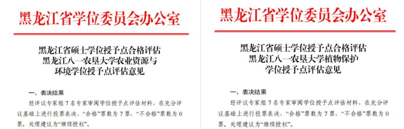2025年,学院3个学位授权点参与合格评估,其中植物保护、农业资源与环境两个一级学科硕士点被国务院学位委员会办公室和黑龙江省学位委员会办公室随机抽中进行评审。7名评议专家严格审阅评估材料、深入质询研讨后,两个硕士点均以“全票同意继续授权”的优异成绩顺利通过本轮周期性合格评估。这一结果标志着学院学科建设水平与研究生培养质量得到国家与省级主管部门的高度认可,为学科高质量发展奠定坚实基础。