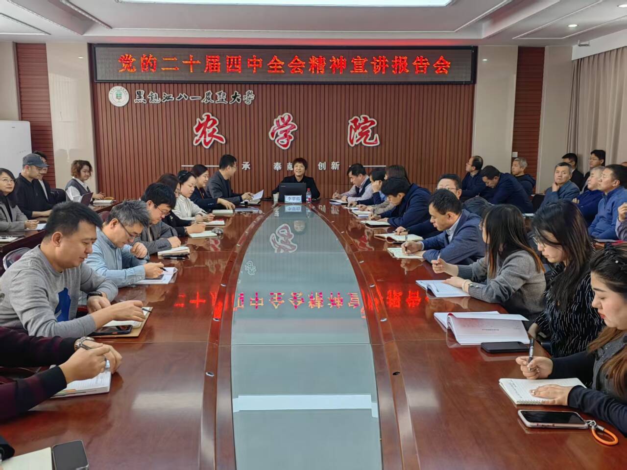 为深入学习宣传贯彻党的二十届四中全会精神,1月12日下午,校长李翠霞在学院4001会议室进行宣讲。学院党委书记姜楠主持会议,校人事处党支部全体党员、农学院全体教职工、学生党员代表参会。