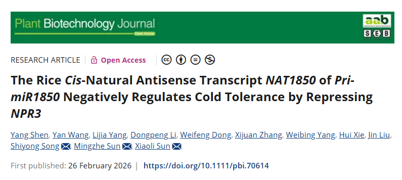 近日,我院孙晓丽和孙明哲教授团队在国际知名植物学期刊《Plant Biotechnology Journal》(中科院一区TOP,IF 10.5)上发表了题为“The rice cis-natural antisense transcript NAT1850 of pri-mir1850 negatively regulates cold tolerance by repressing NPR3”的研究论文。该研究以水稻特异的顺式自然反义长链非编码RNA-NAT1850为切入点,系统揭示pri-miR1850-NAT1850-siR1850模块通过靶向NPR3调控低温应答,并经由独立于NPR3的路径影响氮代谢与产量形成的双重作用机制。该研究为深入理解非编码RNA在作物抗逆与生长发育协同调控中的复杂网络提供了新视角,为分子设计育种培育耐冷高产水稻新品种提供了新的理论依据和潜在靶点。