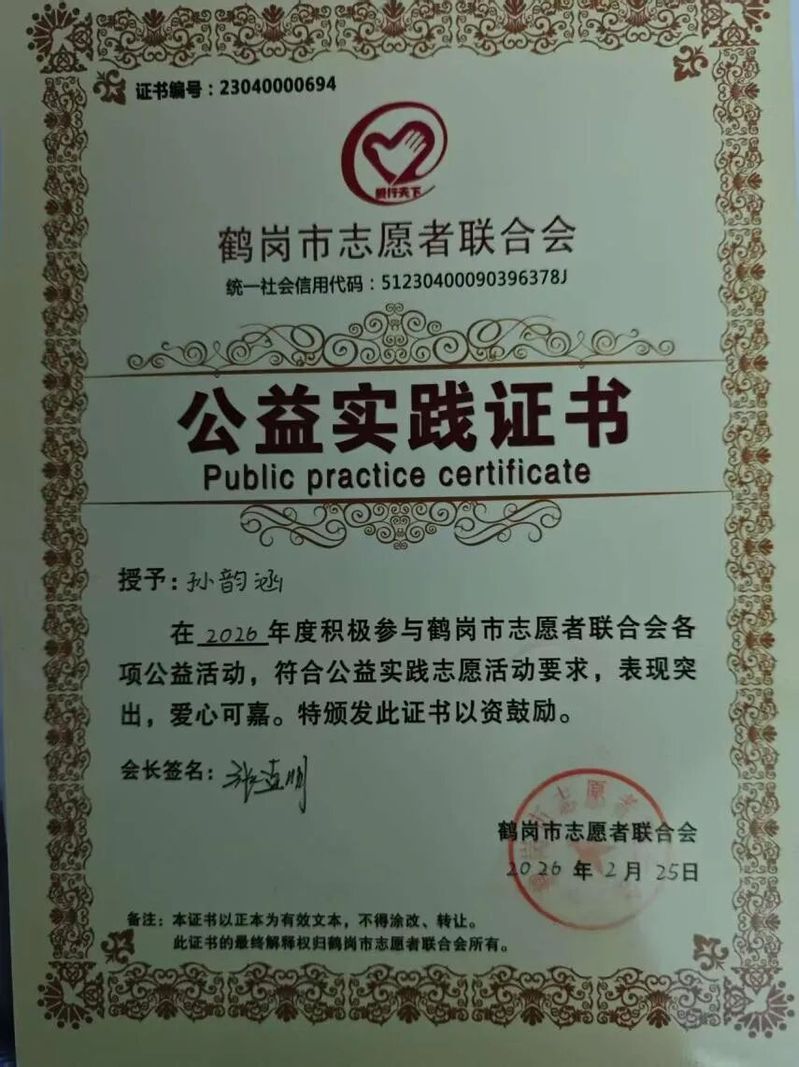 此次实践的付出收获了认可,我荣获市级志愿者组织颁发的荣誉证书。这段经历让我在基层实干中得到历练,今后我会将实践中的收获转化为动力,心系故土,用青春力量为家乡振兴添砖加瓦。