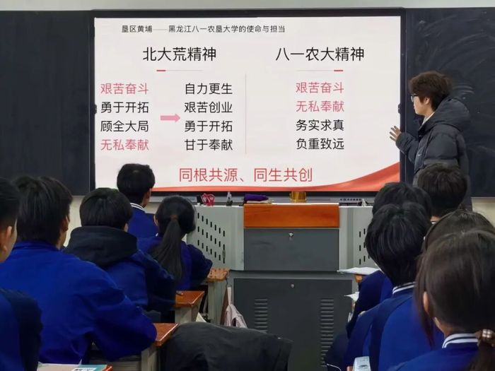 学科特色介绍环节,团队聚焦学校优势专业与人才培养亮点,突出“产学研融合”的办学特色,为学子们勾勒清晰的学业发展路径;资助政策解读则打消了部分学生的升学顾虑,传递出“不让任何一个有梦想的学子掉队”的温暖承诺。整场宣讲既有宏观的价值引领,又有微观的实用指导,让大学的模样在学子心中具象化、清晰化,更让北大荒精神在交流中实现代际传递。