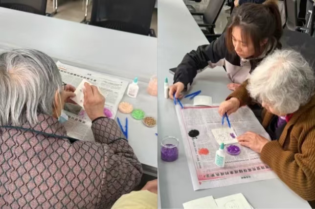 为保障活动顺利开展,种艺美育社团精心筹备了谷物、豆类等丰富的种子创作材料与工具。活动前几日,同学们齐聚种艺美育工作室,提前备齐各类物料,还精心绘制简易图案,为老人们的创作提供便利。福利院内,考虑到老人们的身体状况,同学们两两分组,以二对一的方式陪伴在老人身旁。大家耐心讲解种子画的粘贴技巧,细致协助老人涂抹胶水、粘贴种子,用温柔与耐心化解老人们的拘谨,让现场沉浸在轻松愉悦的手工创作氛围中。