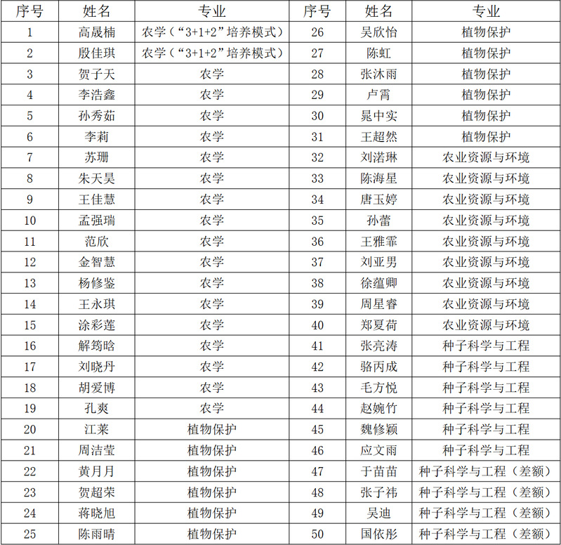 按照学校《关于做好我校2026年推荐优秀应届本科毕业生免试攻读研究生工作的通知》相关要求,学院推免工作小组制定了《农学院2026年推荐优秀应届本科毕业生免试攻读研究生工作办法及实施细则》,依据制定的各专业名额分配方案,对符合申请条件的学生进行资格和材料审查,因部分专业符合申报条件的人数少于分配名额,按照国家一流专业建设需求,将空余名额按需调剂到学院其他专业。符合条件的申请学生按所在专业综合考核成绩排名,确定高晟楠等46人为推免研究生人选,于苗苗等4人为20%差额推荐人选,如有推免研究生放弃推免资格,差额推荐人选依次递补。