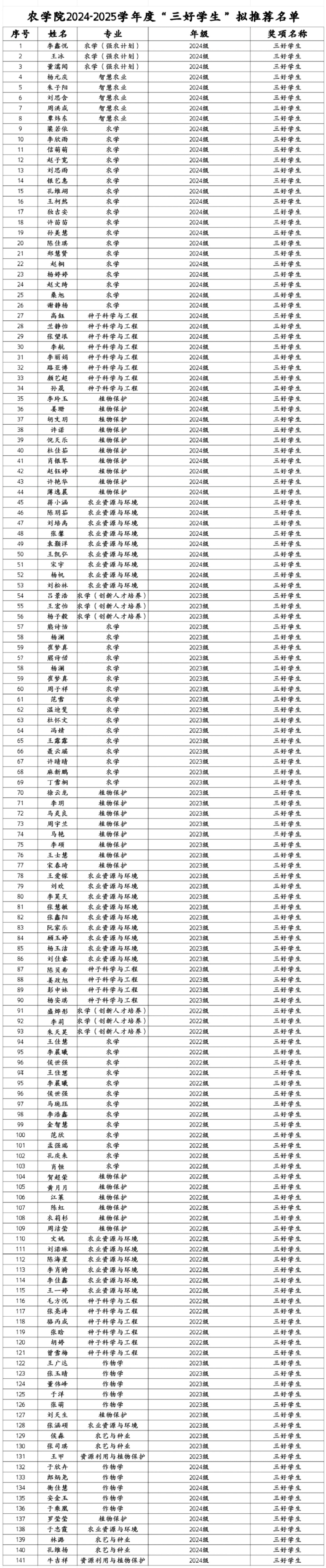 根据《黑龙江八一农垦大学本科生奖励办法》、《黑龙江八一农垦大学奖助学金评选及管理办法》、《黑龙江八一农垦大学本科生奖助学金评选及管理办法》、《黑龙江八一农垦大学研究生奖励暂行办法》的相关规定,拟推荐高晟楠等182名同学获得2024-2025学年“综合奖学金”,董濡闻等140名同学获得2024-2025学年度“三好学生”,2022级农学创新班等12个班级获得2024-2025学年度“优良学风班”等荣誉称号。现将名单向全院师生公示,后附名单。