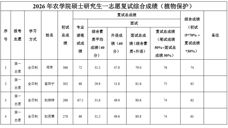 根据《黑龙江八一农垦大学2026年硕士研究生招生考试复试及录取办法》要求,现将农业资源与环境、植物保护、资源利用与植物保护专业考生复试综合成绩进行公示。